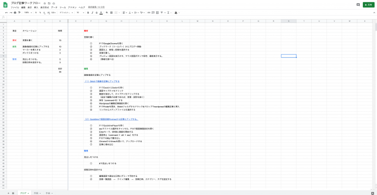 Googleスプレッドシートで作業を階層化する これまで、作業するにあたって大凡の要素分解はしてきたつもりだったが、もう1つワークフローの作りが甘かったことは反省した。オペレーションを全て書き出すというのは、作業を階層化 […] -